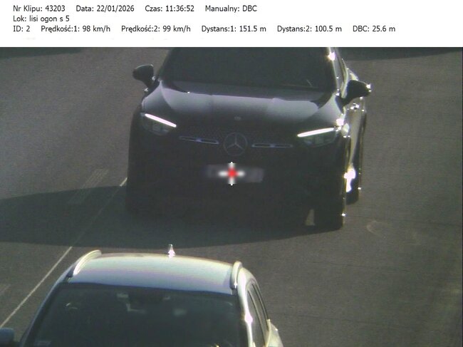 Do przeprowadzonych na drodze ekspresowej S-5 22.01.2026 roku działań, bydgoscy policjanci wykorzystywali urządzenie pomiarowe TruCAM II, wyposażone w funkcję DBC (Distance Between Cars). Ta funkcja umożliwia precyzyjny pomiar odległości pomiędzy pojazdami poruszającymi się drogą ekspresową. Sprzęt ten pozwala na rejestrowanie obrazu oraz przekazywanie materiału dowodowego do patrolu znajdującego się na kolejnym odcinku trasy. Tam policjanci zatrzymują kierowców, którzy nie stosują się do przepisów i pokazują im zarejestrowane wykroczenie na ekranie terminala.