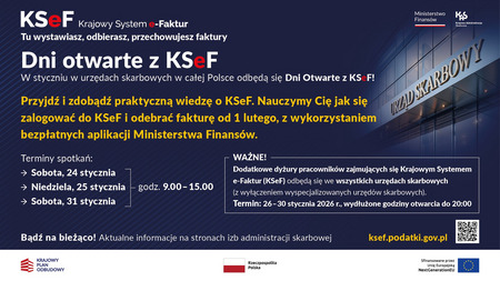 W związku z zaplanowanym na 1 lutego br. wdrożeniem Krajowego Systemu e#-Faktur (KSeF) informujemy, że w dniach 24 i 31 stycznia (soboty) oraz 25 stycznia (niedziela) w urzędach skarbowych w całej Polsce odbędą się Dni Otwarte z KSeF.