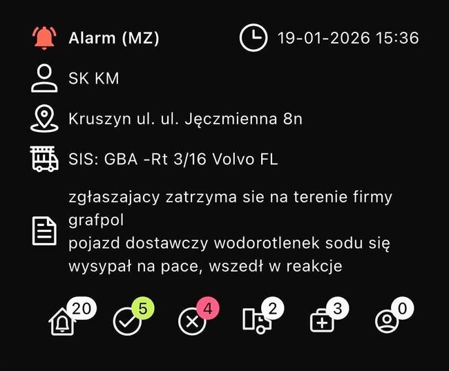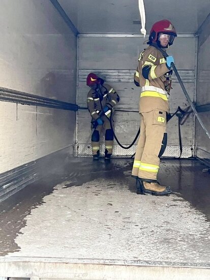 Po godzinie 15 doszło do rozsypania związku chemicznego. Na miejsce udały się dwa zastępy straży pożarnej: OSP Kruszyn i JRG nr 4 w Bydgoszczy. - W przestrzeni ładunkowej samochodu ciężarowego rozsypał się związek chemiczny wodorotlenku sodu, który wszedł w reakcję z wodą tworząc silnie żrący, bezbarwny ług sodowy. Po zneutralizowaniu związku oraz starannym wyczyszczeniu przestrzeni ładunkowej zakończyliśmy działania i wróciliśmy do jednostki - relacjonują strażacy z OSP Kruszyn.