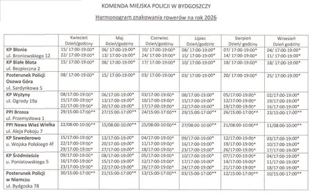 • Harmonogram znakowania rowerów można znaleźć w zakładce PREWENCJA na stronie internetowej Komendy Miejskiej Policji w Bydgoszczy: www.bydgoszcz.policja.gov.pl lub bezpośrednio tutaj.